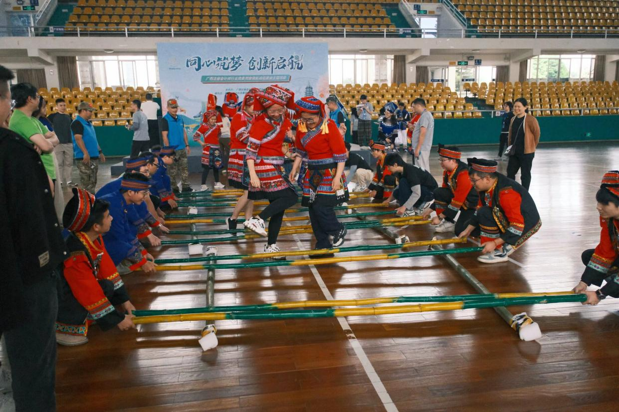 活動中,我們共同體驗了壯族歌舞的魅力,并且換上了民族服飾體驗了廣西民族特色—竹竿舞,感受到了“廣西三月三”特殊濃厚的民族文化氛圍魅力。此外,大家以飽滿的熱情和高漲的積極性參與了挑扁擔、拋繡球、鐵環(huán)接力等富有民族特色的競技項目,在比賽中揮灑著汗水為集體榮譽拼搏著,展現(xiàn)出了團結(jié)協(xié)作、挑戰(zhàn)自我、互相鼓勵的精神風貌。